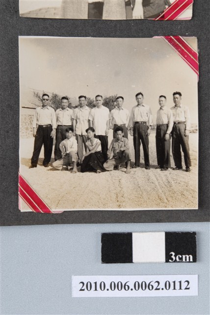 1.本物件為黑白照片,畫面為11個人的合照,前面3個人蹲著,後面8個人站著,他們後面為房屋及樹木。