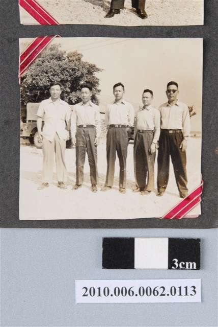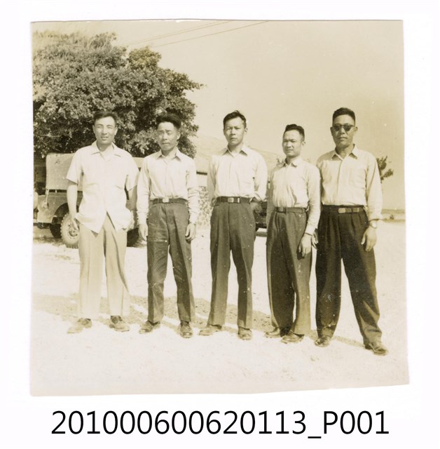 1.本物件為黑白照片,畫面為5個人的合照,5個人並排站著,最右邊的男子戴著墨鏡,他們後面為房屋、車輛及樹木。