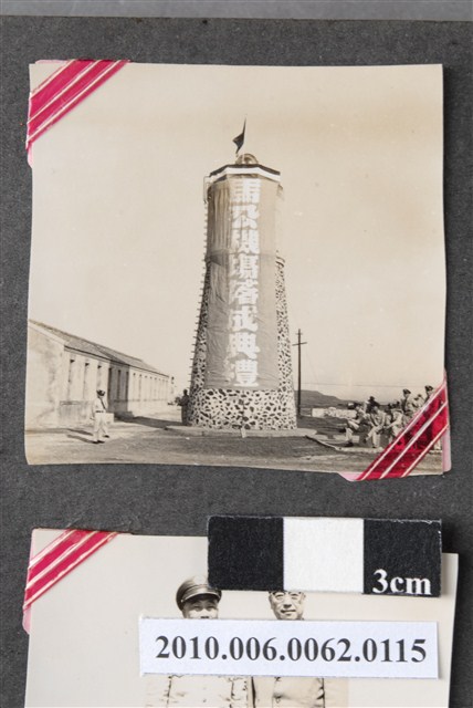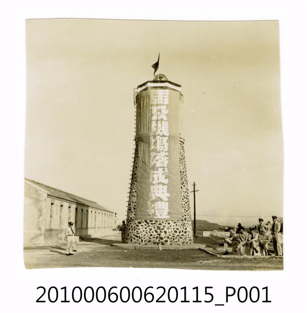1.本物件為黑白照片,畫面為一座塔,塔上掛著「馬公機場落成典禮」的布條,旁邊有建築及一些人。