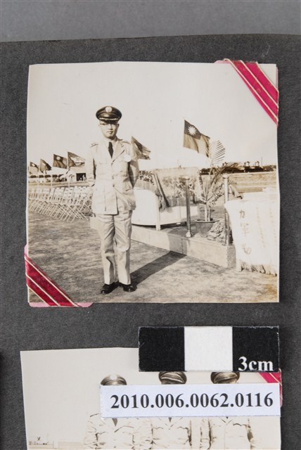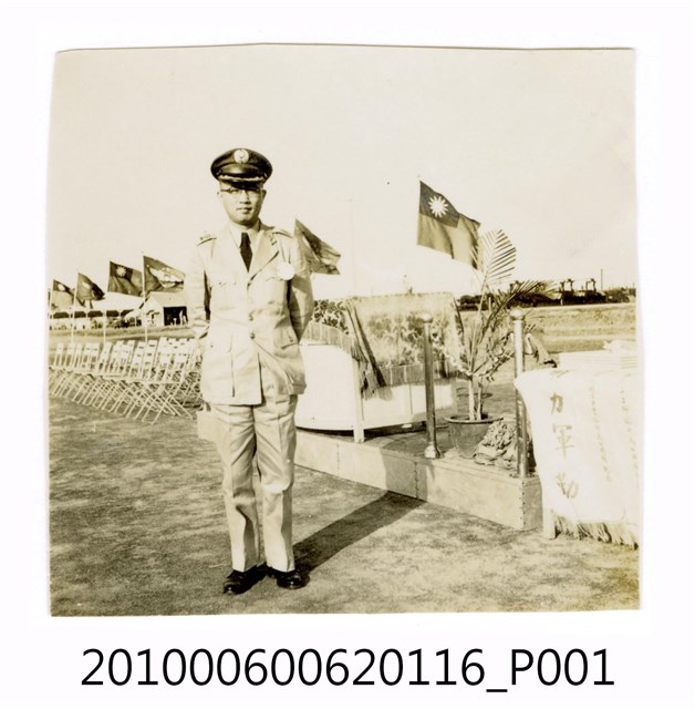 1.本物件為黑白照片,畫面為一位男子獨照,他穿著制服及帽子站在一排國旗旁邊,後面有一些並排的椅子。