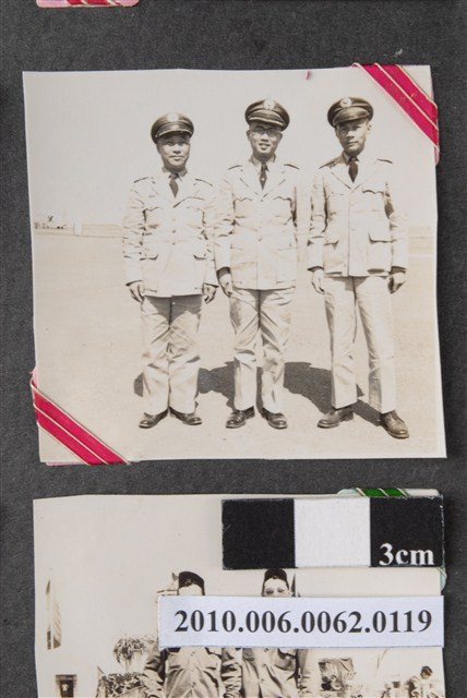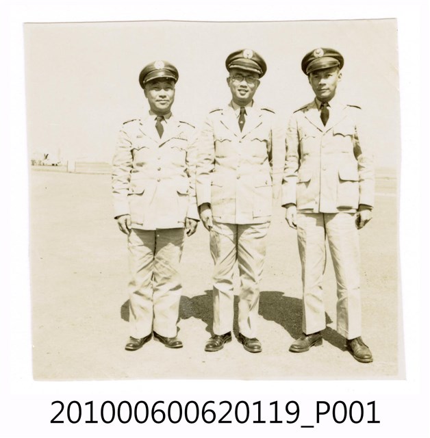1.本物件為黑白照片,畫面為3個男子的合照,3位男子均穿著制服及帽子,且手都放在身旁。