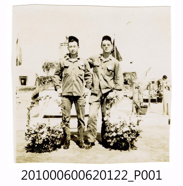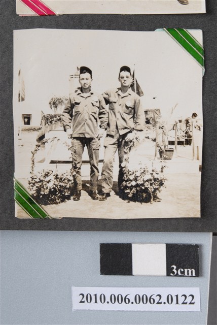 1.本物件為黑白照片,畫面為2個男子的合照,2位男子均穿著制服及帽子,左邊的男子手放在身旁,右邊的男子一手搭著左邊男子的肩膀,後面為國旗及一些造景。