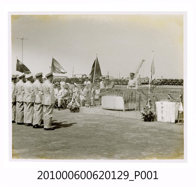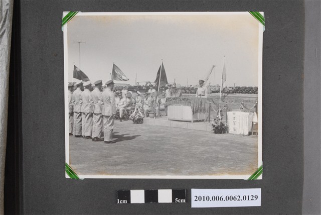 1.本物件為黑白照片,畫面為馬公機場落成典禮致詞現場,有許多人穿著制服排隊站在一個簡易講臺前面,講台前還有一些坐著的人。
