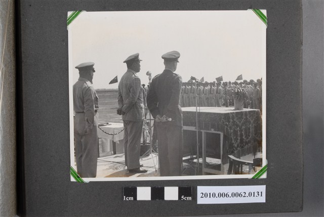 1.本物件為黑白照片,畫面為馬公機場落成典禮致詞現場,有許多人穿著制服排隊站在一個簡易講臺前面,講臺上有一位穿著制服的人正在致詞,他旁邊站著幾個人。