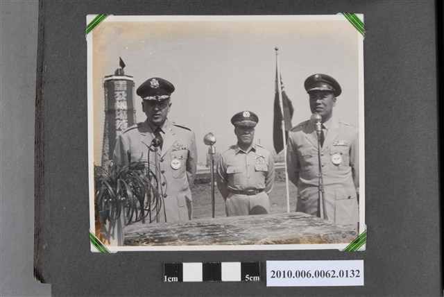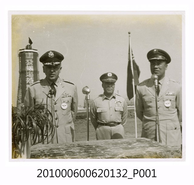 1.本物件為黑白照片,畫面為馬公機場落成典禮致詞現場,有一個簡易講臺上有一位穿著制服的人正在致詞,他旁邊站著兩個人。