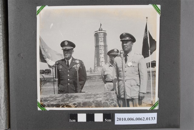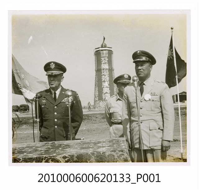 1.本物件為黑白照片,畫面為馬公機場落成典禮致詞現場,有一個簡易講臺上有一位穿著制服的人正在致詞,他旁邊站著兩個人。
