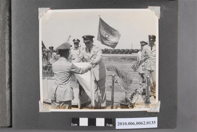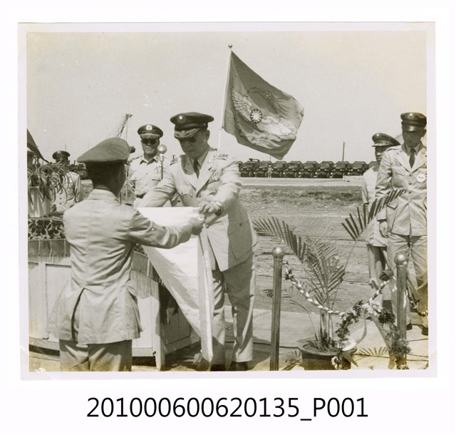 1.本物件為黑白照片,畫面為馬公機場落成典禮儀式現場,有一個簡易講臺上有一位穿著制服的人正在頒發東西,他面前有問穿著制服的人正在受領,旁邊站著幾個人。