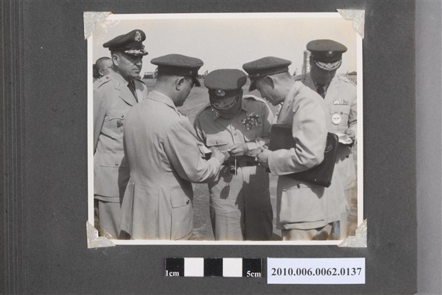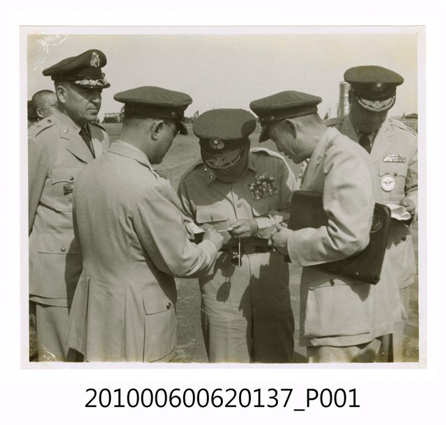 1.本物件為黑白照片,畫面為馬公機場落成典禮來賓,為5位穿著制服的男子圍著正在低頭看東西。