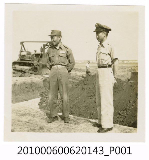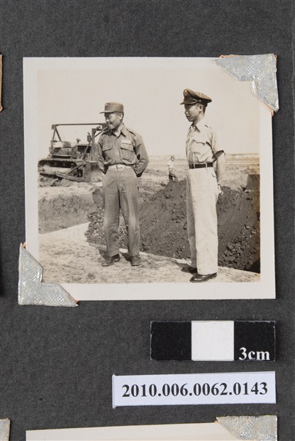 1.本物件為黑白照片,畫面為兩位穿著制服的男子站在土石地上,且都看向左方,他們身後為工程機具及幾個人在進行工程。