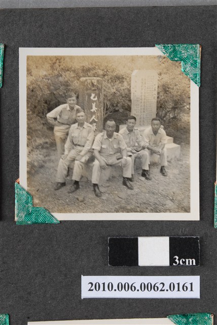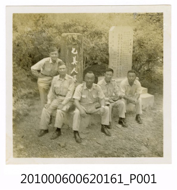 1.本物件為黑白照片,畫面為七美人塚五人合照,4位穿著制服的男子坐在七美人塚旁邊,有一位站著,他們後面為一些樹叢。