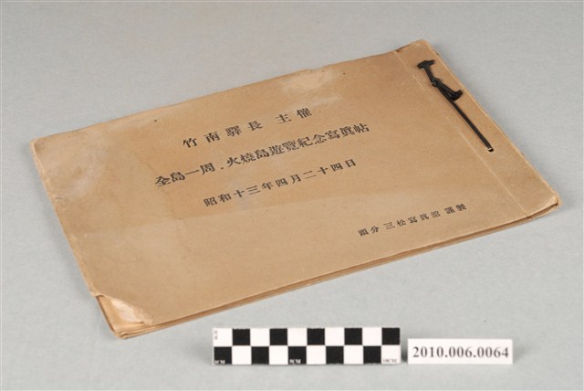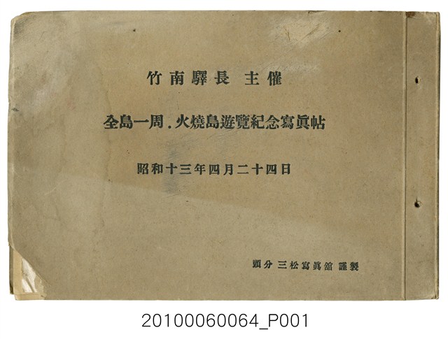 1.本物件為竹南驛長主催《全島一周、火燒島遊覽紀念》寫真帖,上有「 昭和十三年四月二十四日 頭分三松寫真館 謹製」,書皮封面為米色紙皮。內容為全臺一周及火燒島(今綠島)遊覽寫真帖,由頭分三松寫真館製作,其有臺灣北部30人參加,附有其販賣店主之名單,寫真照片有10張,分別是竹南火車站、臺南神社、火燒島、大球丸、臺東港、花蓮港車站、花蓮神社的吊橋、太魯閣峽谷,團員於各地港口以及神社之寫真。