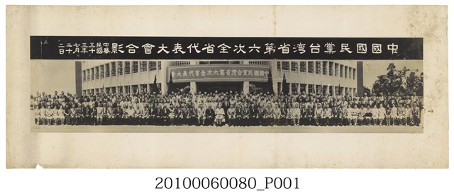 此物件為「中國國民黨臺灣省第六次全省代表大會合影」,為一黑白橫幅相片,攝影日期為1964年7月22日。 此件文物的主要人物為蔣中正,生於1887年10月31日,浙江奉化人,原名瑞元,後改名中正,字介石,擔任中華民國自行憲開始的第一至第五任總統,並連續擔任中國國民黨總裁。蔣中正早年考送日本振武學校,並在1907年加入中國同盟會,其後參加孫文的中華革命黨,在「六一六事變」後成為孫文心腹,並且參與創建黃埔軍校。孫文死後,蔣中正擔任北伐總司令,率領國民革命軍成功北伐,領有中國大部份領土,後於1937年率軍對抗日軍侵略,並獲得勝利。1949年,中國國民黨在第二次國共內戰中失利,蔣中正和中華民國政府撤退臺灣,在臺發布《動員戡亂臨時條款》,實行長達38年的戒嚴令。臺灣社會在戒嚴時期經歷的權威專制,史稱「白色恐怖」。蔣中正於1975年4月5日去逝,其對於中國近代史以及東亞史發展有著深刻影響。 中國國民黨在臺灣之統治,始於二戰後的接收時期。1945年日本於太平洋戰爭中戰敗投降,國民政府設置臺灣省行政長官公署負責臺灣的接收事務,並透過「三民主義青年團」、「國民黨臺灣省執行委員會」、「國民黨臺灣省黨部」等機構穩固社會各方面的統治基礎。1950年代,中國國民黨施行多次黨務改造,透過黨員大會、各級黨員代表大會,以及黨內各級委員會之層層建置,使其動員機制深入地方社會。