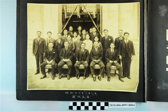 1.本物件為昭和12年(1937)1月1日臺灣銀行彰化支店新年合影之黑白照片。照片中間為彰化分行員工分4排,第1排五名男子坐在椅子上,且穿著正式三件式西服。後面3排採站姿,男性也多穿著三件式西服,女生穿著洋裝。背景為彰化分行大門口,門口上方有新年裝飾之連繩結與注連飾。照片下方相簿載明拍攝地點與日期為「昭和十二年一月一日彰化支店」。