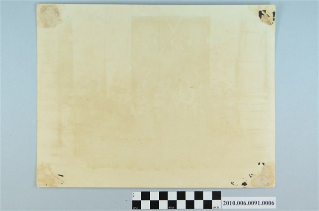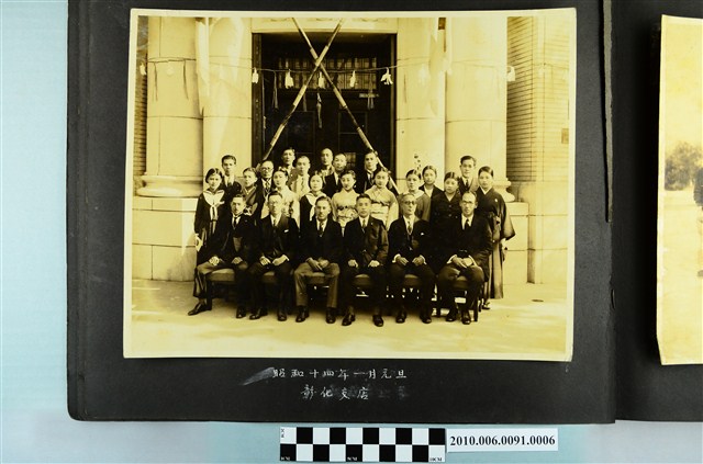 1.本物件為昭和14年(1939)元旦臺灣銀行彰化支店新年合影之黑白照片。照片中間為銀行員工,分4排,第1排6名男子穿著三件式西裝坐在椅子上,第2排以後員工採站姿,男生穿著西服,女生除洋裝外,多穿著和服。背景為彰化分行大門口,門口上方有新年裝飾之連繩結與注連飾。照片下方相簿載明拍攝地點與日期為「昭和十四年一月元旦彰化支店」。