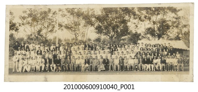 本物件為大合照之黑白照片。照片中分4排,第1排坐在椅子上,中間右18手拿獎盃,腿上有錦標旗幟,顯示該張照片應是比賽奪得錦標後相關人員大合照,照片後方為樹林,右邊有一棟建築物。此照片應是臺灣銀行內部運動會之一。