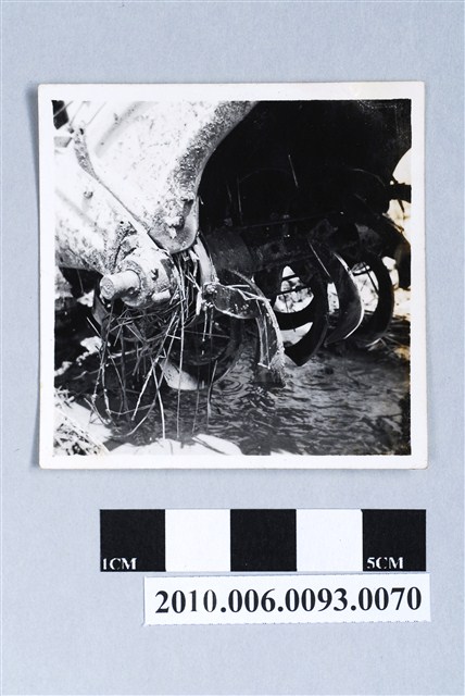 1.本物件是中國農業機械公司研究發展室相簿中的中農井關型耕耘機使用情形之照片。照片主要特寫機器使用後耕耘刀的狀況,刀的一側卡有稻草。