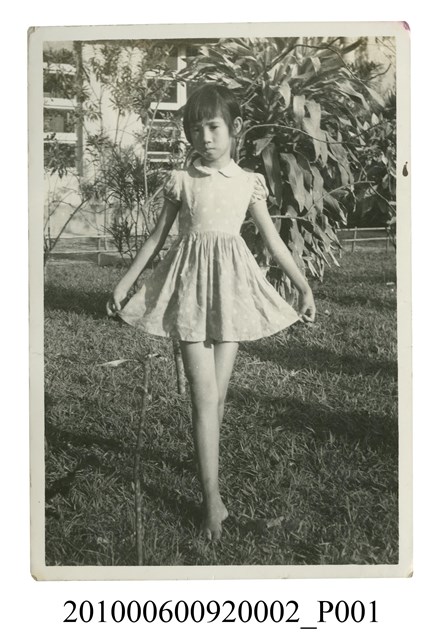1.本文物為著有領短袖洋裝女童獨影之照片,照片中的女孩身穿洋裝,雙手微微拉起裙擺,站姿呈雙腳交叉墊起腳尖的姿勢,宛如一位芭蕾舞者,正面朝向鏡頭拍照。照片背景為戶外,有很多植栽。屬於物件編號2010.006.0096「屏東女中林德泉老師之家庭相簿」內的相片。2.照片人物據曾就讀屏東女中的陳萬足女士之訪談,得知應屬於屏東女中體育老師林德泉老師的小女兒林真珠。