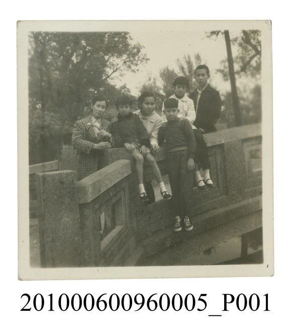 1.本文物為6人依靠於拱橋欄杆合影之照片,照片中共5位孩童及1位婦人,6人或坐或靠的在欄杆旁,皆身穿長袖衣物,正面朝向鏡頭,面帶微笑合影。照片背景為戶外,有很多植栽。屬於物件編號2010.006.0096「屏東女中林德泉老師之家庭相簿」內的相片。2.照片人物據鄭冠榮老師、王德明老師、陳萬足女士之訪談,推測為屏東女中體育老師林德泉老師的夫人及小孩們的合照。