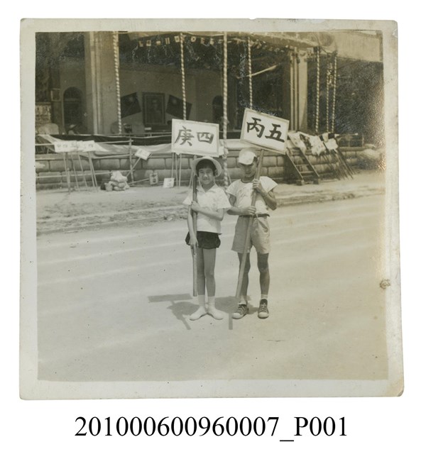 1.本文物為2位孩童手持立牌合影之照片,照片中2位孩童,一男一女拿著「四庚」、「五丙」的立牌,頭戴帽子、身穿運動服、腳穿包鞋,站立在司令臺前方操場跑道,憶起合影留念。屬於物件編號2010.006.0096「屏東女中林德泉老師之家庭相簿」內的相片。2.照片背景據曾就讀屏東女中的陳萬足女士之訪談,推測為屏東女中旁仁愛國小的操場及司令台。陳萬足女士就讀仁愛國小、屏東女中初中部,直升屏東女中高中部,對於照片背景有一定的熟悉。