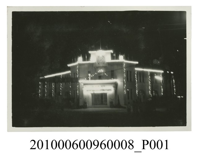 1.本文物為夜晚燈光裝飾建物之照片,照片中漆黑的背景,將被燈光裝飾的建築物凸顯在黑夜之中,然沒有對焦,無法清晰辨別此建築物為何物。屬於物件編號2010.006.0096「屏東女中林德泉老師之家庭相簿」內的相片。2.照片景物據鄭冠榮老師、王德明老師、陳萬足女士之訪談,因照片模糊辨識不易,僅推測可能為屏東縣政府舊址,現為屏東太平洋SOGO百貨。