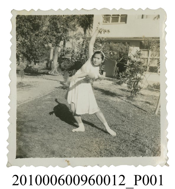 1.本文物為著短袖長洋裝女子獨影之照片,照片中女子頭上帶有一髮箍,身穿白色短袖長洋裝,腳穿白襪踩在草地上,身軀展現一生動的跳舞姿態,臉部側向一旁,無直視鏡頭拍照。拍照背景為戶外,有許多植栽及一棟建物。屬於物件編號2010.006.0096「屏東女中林德泉老師之家庭相簿」內的相片。2.照片人物據鄭冠榮老師、王德明老師、陳萬足女士之訪談,推測為屏東女中體育老師林德泉老師的大女兒林純珠。
