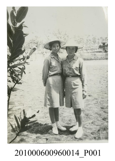 1.本文物為2位頭戴斗笠身穿屏東女中軍訓服女子合影之照片,照片中2位女子頭戴斗笠,身穿有領長袖裙裝,腰間繫有腰帶,腳穿長白襪白鞋。照片背景為戶外,有許多植栽。屬於物件編號2010.006.0096「屏東女中林德泉老師之家庭相簿」內的相片。2.照片人物據鄭冠榮老師、王德明老師、陳萬足女士之訪談,推測為屏東女中體育老師林德泉老師的女兒,就讀屏東女中時軍訓課行軍的照片。據王德明老師、陳萬足女士2位曾就讀屏東女中的校園生活記憶,得知屏東女中早期軍訓課,會著軍訓服、頭戴斗笠、腳穿白布鞋行軍至長治國中。