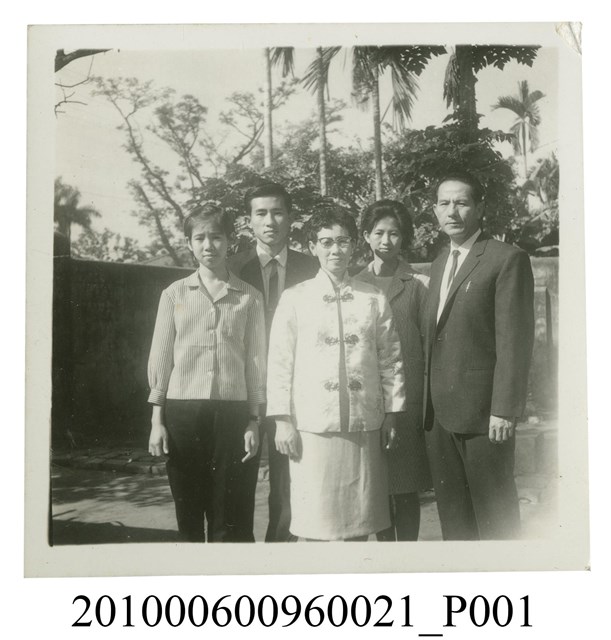 1.本文物為5人站立於戶外合影之照片,照片中2男3女皆著正式服裝,前排右一男子身穿西裝,身體微側;前排中間年紀較長女子,戴有眼鏡,身穿唐裝外套搭配裙裝;前排左一女子身穿條紋襯衫搭配長褲,左手配戴手錶;後排右一女子身穿裙裝;後排左一男子身穿西裝。照片背景為戶外,有許多植栽。屬於物件編號2010.006.0096「屏東女中林德泉老師之家庭相簿」內的相片。2.照片人物據鄭冠榮老師、王德明老師、陳萬足女士之訪談,推測為屏東女中體育老師林德泉老師與家人的合影。