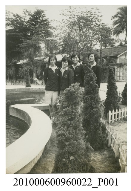 1.本文物為4位女子站立於水池旁合影之照片,4位女子身穿相同服飾:立領襯衫裙裝搭配繡有圖飾的外套,站立於水池旁合影。拍照背景為戶外,有許多植栽及平房。屬於物件編號2010.006.0096「屏東女中林德泉老師之家庭相簿」內的相片。2.照片人物據鄭冠榮老師、王德明老師、陳萬足女士之訪談,推測為屏東女中體育老師林德泉老師的小女兒林真珠,與同學在屏東女中校園內噴水池的合影。