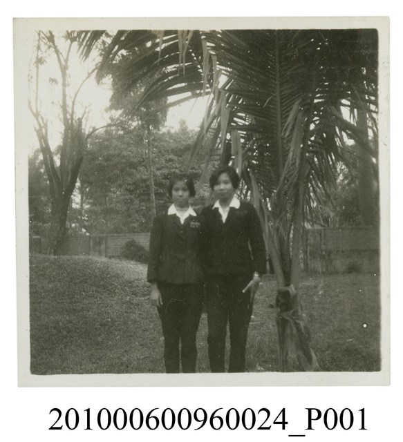 1.本文物為2位女子站立於植栽旁合影之照片,照片中右一女子身穿有領襯衫,褲裝搭配外套,左手腕戴有一飾品,手掌伏貼於大腿;左一女子頭上別有一髮飾,身穿有領襯衫,褲裝搭配外套,外套左胸口繡有字樣,但因模糊不易辨識。2人站立於植栽旁合影。屬於物件編號2010.006.0096「屏東女中林德泉老師之家庭相簿」內的相片。2.照片背景據鄭冠榮老師、王德明老師、陳萬足女士之訪談,推測為屏東女中校園或屏東女中正對面的中山公園(現稱屏東公園),屏東女中過去曾為農林實驗所,校園內種植許多熱帶植物,學生經常在校園拍照,亦常