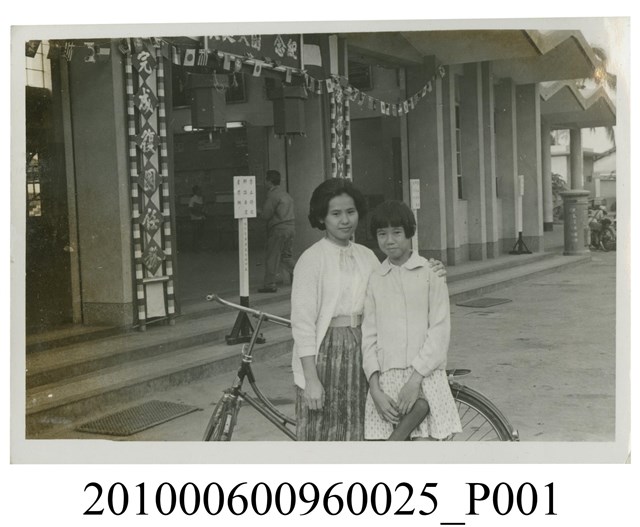1.本文物為二位女子在屏東車站前合影之照片,照片中左邊女子著裙裝,腰間繫腰帶,身體微側左手放於右邊女子左肩;右邊女子身穿長袖裙裝,雙手持拿一物,靦腆的依靠著左邊女子,2人身後有1輛腳踏車,腳踏車停於屏東車站前空地,建物入口處擺有一告示牌,牆上懸掛各國國旗,兩側柱子貼有標語,上方掛有布條。屬於物件編號2010.006.0096「屏東女中林德泉老師之家庭相簿」內的相片。2.照片人物據鄭冠榮老師、王德明老師、陳萬足女士之訪談,推測為屏東女中體育老師林德泉老師的女兒們。拍照地點為屏東車站舊站,民國105年拆除