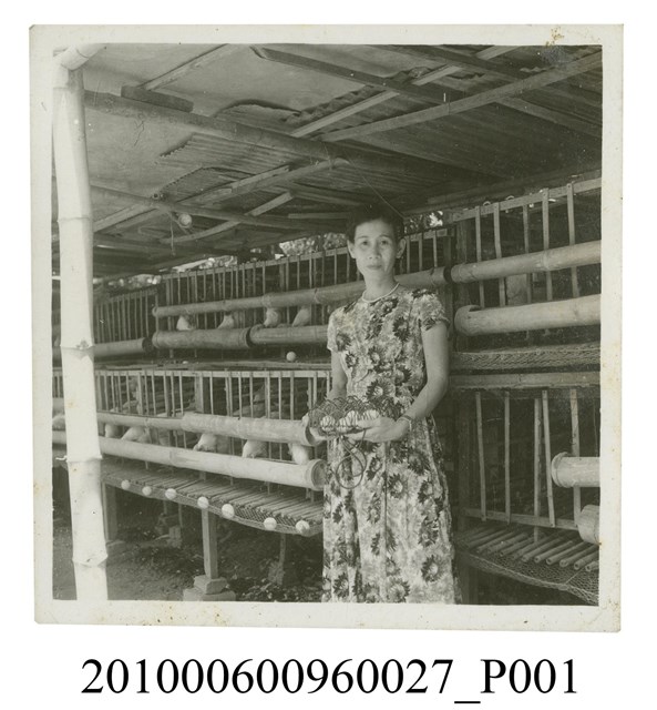 1.本文物為一婦人手捧一盆雞蛋站立於雞舍內獨影之照片,照片中婦人身穿連身花裙,脖子戴有一串珍珠,手捧著一盆雞蛋,站立於飼養雞隻的欄架前,欄架上有許多雞蛋。屬於物件編號2010.006.0096「屏東女中林德泉老師之家庭相簿」內的相片。2.2.照片人物據鄭冠榮老師、王德明老師、陳萬足女士之訪談,推測為屏東女中體育老師林德泉老師的夫人。