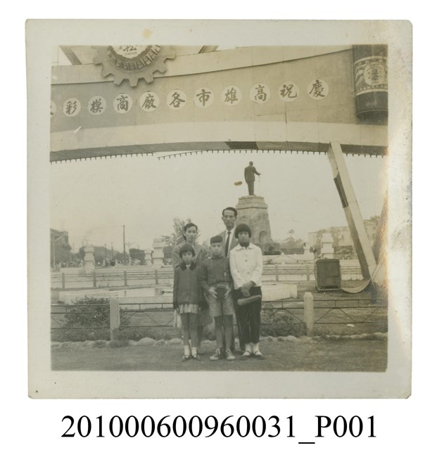 1.本文物為5人站立於慶祝高雄市各廠商摸彩大會大型活動拱門前合影之照片,照片中2位長者站於後排,3位孩童站於前排,5人皆穿著正式服裝,前排中間男孩身前掛一類似相機之物品,前排右側女孩手持一物品。5人身後為大型活動拱門,貼有「慶祝高雄市各廠商摸彩大會」等字樣,還有立體的黑松汽水瓶身及瓶蓋裝飾物,照片背景為戶外,可見有一人物銅像豎立於後方。屬於物件編號2010.006.0096「屏東女中林德泉老師之家庭相簿」內的相片。2.照片人物據鄭冠榮老師、王德明老師、陳萬足女士之訪談,推測為屏東女中體育老師林德泉老師