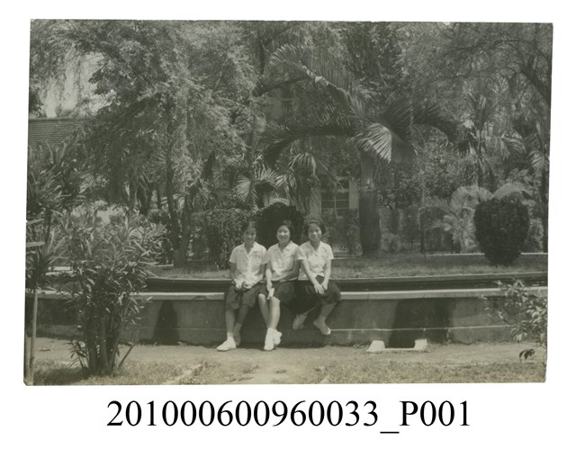 1.本文物為3位女子身穿制服坐於水池旁合影之照片,照片中3人皆身穿制服裙裝,白色短袖襯衫左胸口繡有字樣,但因模糊不易辨識,腳穿白襪白鞋。3人坐於水池旁拍照。屬於物件編號2010.006.0096「屏東女中林德泉老師之家庭相簿」內的相片。2.照片人物據鄭冠榮老師、王德明老師、陳萬足女士之訪談,推測為屏東女中體育老師林德泉老師的小女兒林真珠,與同學在屏東女中校園內噴水池的合影。