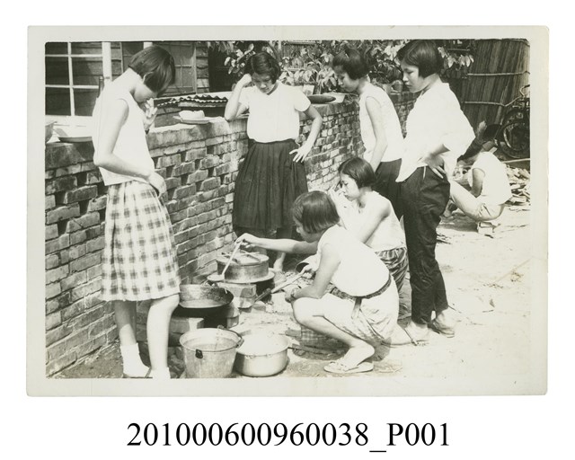 1.本文物為一群女子烹煮食物的照片,照片中6位女子或站或蹲,圍繞在矮牆旁的露天簡易爐灶,烹煮食物。屬於物件編號2010.006.0096「屏東女中林德泉老師之家庭相簿」內的相片。2.照片畫面據鄭冠榮老師、王德明老師、陳萬足女士之訪談,推測為民國4、50年代學生於屏東女中露營地露營野炊的畫面,當時屏東女中露營地設置於學校操場旁。