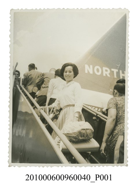 1.本文物為一女子於登機梯上之照片,照片中一群登機乘客中,身穿有領長袖裙裝,腰間繫有腰帶之女子於登機時,轉身面向鏡頭拍照,右手扶著樓梯扶手,左手提著隨身行李。屬於物件編號2010.006.0096「屏東女中林德泉老師之家庭相簿」內的相片。2.照片畫面據鄭冠榮老師、王德明老師、陳萬足女士之訪談,推測為屏東女中體育老師林德泉老師的大女兒林純珠登機。