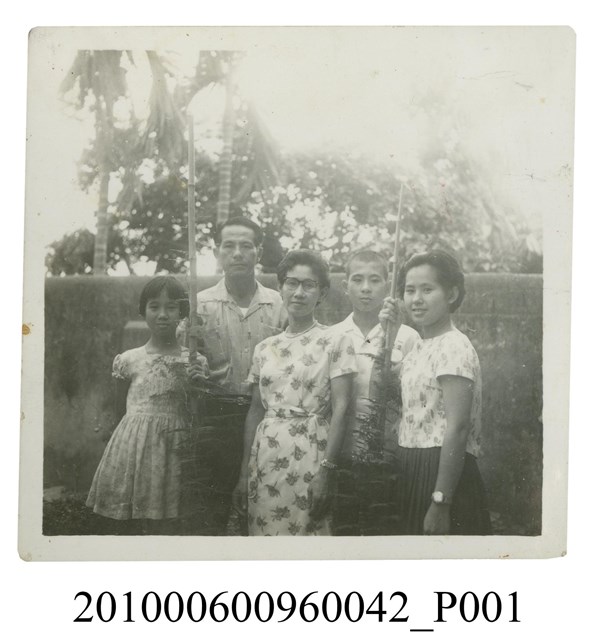 1.本文物為5人站立於矮牆前合影之照片,照片中2男3女,前排左右側之女子手持樹枝,中間女子戴眼鏡,身穿花紋連身長裙,脖子配戴一串珍珠;後排較矮的男子留著平頭,另一男子身穿有圖樣的襯衫。5人站在矮牆前拍照,照片背景為戶外,有許多植栽。屬於物件編號2010.006.0096「屏東女中林德泉老師之家庭相簿」內的相片。2.照片人物據鄭冠榮老師、王德明老師、陳萬足女士之訪談,推測為屏東女中體育老師林德泉老師與家人的合照。