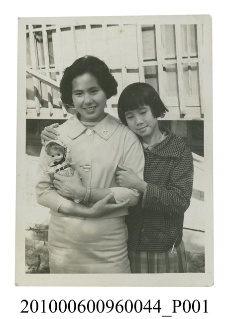 1.本文物為2位女子站立於屋外窗前合影之照片,照片中身高較矮的女子身穿圓點圖樣的外套,雙手從身後環抱著身高較高的女子,臉依偎在其左肩;身高較高的女子雙手重疊擺放在腰間,左手腕戴有手錶,手中握著一洋娃娃,2人站立於屋外窗前拍照。屬於物件編號2010.006.0096「屏東女中林德泉老師之家庭相簿」內的相片。2.照片人物據鄭冠榮老師、王德明老師、陳萬足女士之訪談,得知應是屏東女中體育老師林德泉老師的女兒們,老師一家人居住在屏東女中日式教職員宿舍,故推斷拍照地點為家門前庭院。