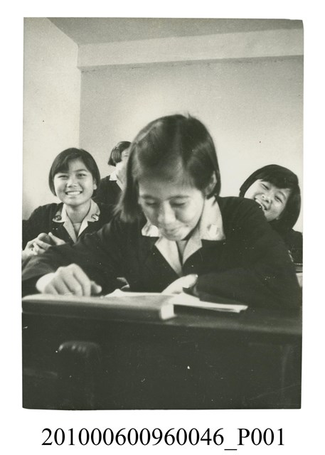 1.本文物為女學生於教室學習之照片,照片中前排女學生低頭閱讀,後排2位女學生燦爛的笑容面對鏡頭。屬於物件編號2010.006.0096「屏東女中林德泉老師之家庭相簿」內的相片。2.照片人物據鄭冠榮老師、王德明老師、陳萬足女士之訪談,得知應是屏東女中體育老師林德泉老師的小女兒林真珠,坐於屏東女中教室內閱讀。