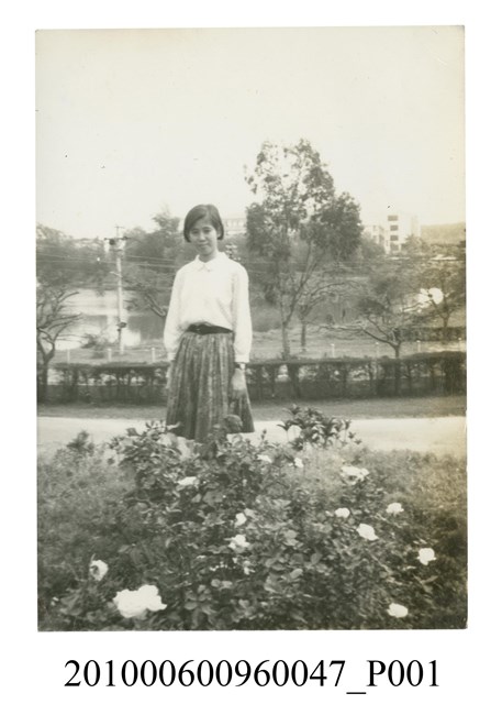 1.本文物為一女子站立於花叢後方獨影之照片,照片中女子身穿有領長袖裙裝,腰間繫有腰帶,站立在花叢後方,微笑面對鏡頭拍照。拍照背景為戶外,有許多植栽,遠處似乎為一湖。屬於物件編號2010.006.0096「屏東女中林德泉老師之家庭相簿」內的相片。2.照片人物據鄭冠榮老師、王德明老師、陳萬足女士之訪談,得知應是屏東女中體育老師林德泉老師的小女兒林真珠。