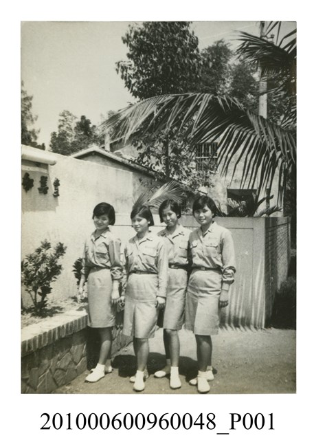 1.本文物為4位身穿屏東女中軍訓服女子站立合影之照片,照片中4位女子身穿相同制服,腰間繫有腰帶,呈相同站姿面對鏡頭拍照。屬於物件編號2010.006.0096「屏東女中林德泉老師之家庭相簿」內的相片。2.照片人物據鄭冠榮老師、王德明老師、陳萬足女士之訪談,推測為屏東女中體育老師林德泉老師的女兒,就讀屏東女中時軍訓課行軍的照片。據王德明老師、陳萬足女士2位曾就讀屏東女中的校園生活記憶,得知屏東女中早期軍訓課,會著軍訓服、頭戴斗笠、腳穿白布鞋行軍至長治國中。