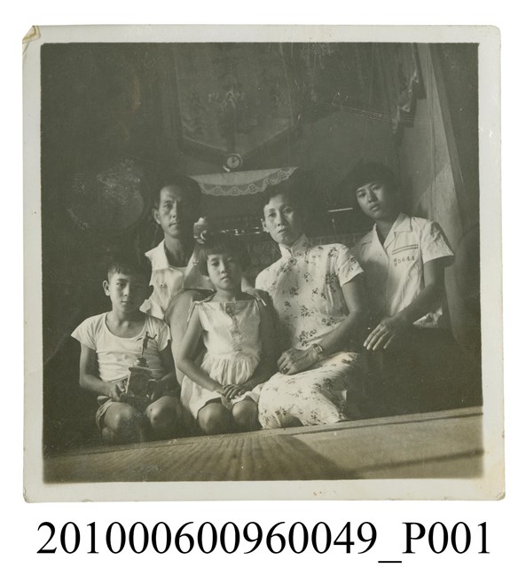 本文物為5人跪坐在榻榻米合影之照片,照片中共2男3女,右一女子身穿屏女制服,左手扶於膝蓋,呈半跪姿;右二女子年紀較長,身穿旗袍,左手配戴手錶,無名指配戴戒指;左二女童呈跪姿,身穿無袖連身裙,雙手重疊置於雙膝之間;左一男童呈跪姿,身穿短袖短褲,雙手捧著一雕像裝飾物,置於雙膝之間;年紀較長的男子於4人身後。拍照背景為室內,後方可依稀看到牆面掛有錦旗及些家具、裝飾物。屬於物件編號2010.006.0096「屏東女中林德泉老師之家庭相簿」內的相片。2.照片人物據鄭冠榮老師、王德明老師、陳萬足女士之訪談,推測為屏東女中體育老師林德泉老師全家合照。老師一家人居住在屏東女中日式教職員宿舍,故推斷拍照地點為宿舍內。