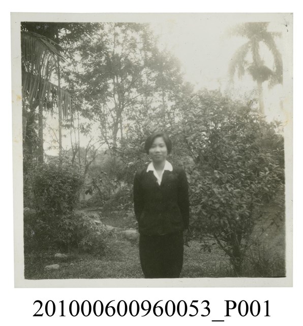 1.本文物為一女子站立於植栽前獨影之照片,照片中女子身穿有領襯衫,褲裝搭配外套,雙手擺於身後,抿嘴微笑正面朝向鏡頭拍照。屬於物件編號2010.006.0096「屏東女中林德泉老師之家庭相簿」內的相片。2.照片景物據鄭冠榮老師、王德明老師、陳萬足女士之訪談,應為屏東女中校園,屏東女中過去曾為農林實驗所,校園內種植許多熱帶植物,學生經常在校園拍照。