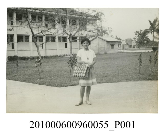 1.本文物為一女子著裙裝站立於空地獨影之照片,照片中女子穿著有領短袖上衣搭配裙裝,脖子掛有一鍊子飾品,右手臂掛有一提袋,右手握著左手腕交錯於腰間,腳穿平底拖鞋。女子站立於一棟建物外之水泥空地拍照,遠方可看見籃球場、平房等景物。屬於物件編號2010.006.0096「屏東女中林德泉老師之家庭相簿」內的相片。2.照片畫面據鄭冠榮老師、王德明老師、陳萬足女士之訪談,推測為屏東女中校園一隅。