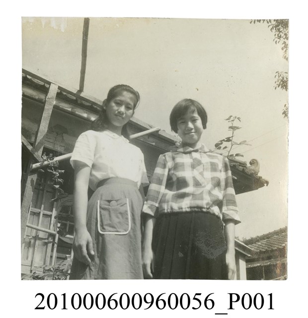 1.本文物為2位女子站立於屋前合影之照片,照片中右側短髮女子,身穿格子五分袖上衣,搭配裙裝;左側長髮女子,身穿有領素色短袖,搭配高腰裙裝。2人俯視正面朝向鏡頭,鏡頭以仰視的角度拍攝,照片背景可見房子屋簷。屬於物件編號2010.006.0096「屏東女中林德泉老師之家庭相簿」內的相片。2.照片人物據鄭冠榮老師、王德明老師、陳萬足女士之訪談,推測為屏東女中體育老師林德泉老師小女兒林真珠與朋友的合照。老師一家人居住在屏東女中日式教職員宿舍,故推斷拍照地點為宿舍前。