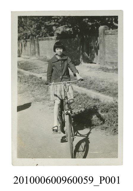 1.本文物為一女孩騎乘腳踏車獨影之照片,照片中短髮女孩身穿圓點圖案的外套,搭配格子短裙,腳穿平底鞋,騎乘著腳踏車在道路上。屬於物件編號2010.006.0096「屏東女中林德泉老師之家庭相簿」內的相片。2.照片人物據鄭冠榮老師、王德明老師、陳萬足女士之訪談,推測為屏東女中體育老師林德泉老師的小女兒林真珠。
