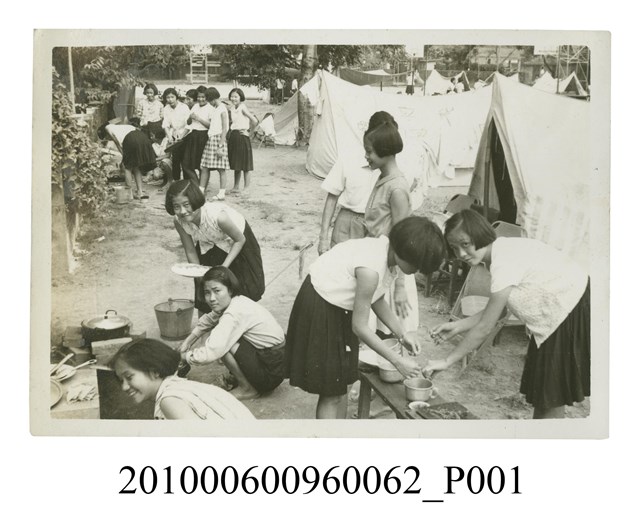1.本文物為一大群女學生露營活動之照片,照片中一群一群女學生正在準備烹飪,有的人顧爐灶,有的人準備食材,照片背景可見一頂頂搭建好的帳篷。屬於物件編號2010.006.0096「屏東女中林德泉老師之家庭相簿」內的相片。2.照片畫面據鄭冠榮老師、王德明老師、陳萬足女士之訪談,推測為民國4、50年代學生於屏東女中露營地露營野炊的畫面,當時屏東女中露營地設置於學校操場旁。