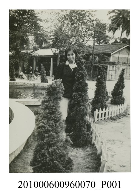 1.本文物為一女子站立於水池旁獨影之照片,照片中短髮女子站立於水池旁,身前有矮樹叢,身體微微傾斜,微笑面向鏡頭拍照,照片背景有許多植栽及平房。屬於物件編號2010.006.0096「屏東女中林德泉老師之家庭相簿」內的相片。2.照片人物據鄭冠榮老師、王德明老師、陳萬足女士之訪談,推測為屏東女中體育老師林德泉老師的小女兒林真珠,在屏東女中校園內噴水池所拍的照片。