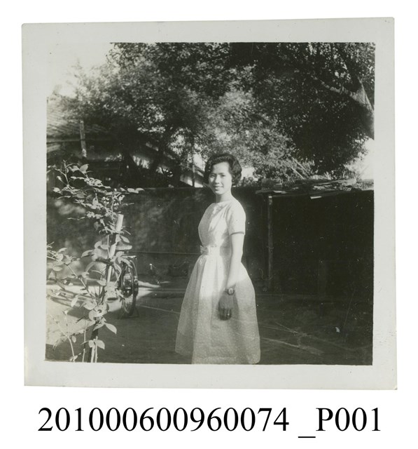 1.本文物為一女子側身站立於空地獨影之照片,照片中女子身穿短袖連身洋裝,左手戴有手錶,側身站立,露齒微笑面向鏡頭拍照。照片背景為戶外,有許多植栽。屬於物件編號2010.006.0096「屏東女中林德泉老師之家庭相簿」內的相片。2.照片人物據鄭冠榮老師、王德明老師、陳萬足女士之訪談,推測為屏東女中體育老師林德泉老師的大女兒林純珠。