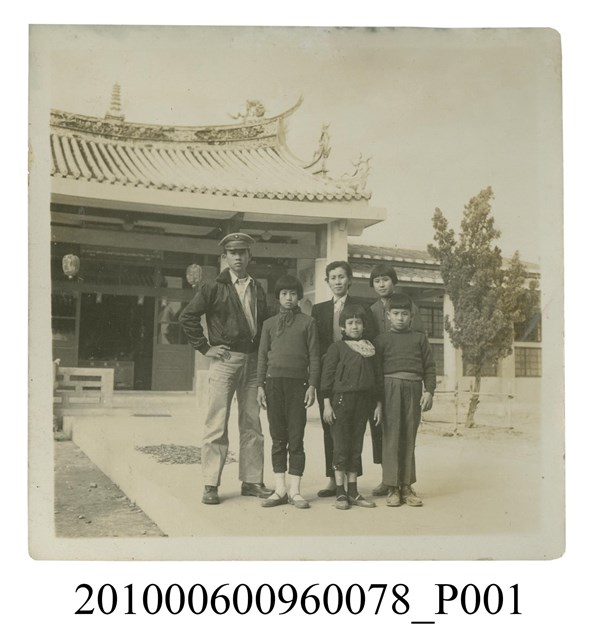 1.本文物為6人站立於屏東孔廟前空地合影之照片,照片中左一年紀較長的男子,頭戴帽子,身穿襯衫搭配飛行外套,右手撐於腰際;前排3位孩童身穿長袖衣物,雙手垂放,精神抖擻的挺直身體站立;後排2位女子亦站立面向鏡頭。屬於物件編號2010.006.0096「屏東女中林德泉老師之家庭相簿」內的相片。2.照片人物據鄭冠榮老師、王德明老師、陳萬足女士之訪談,推測為屏東女中體育老師林德泉老師與家人一同在屏東孔廟前拍照。
