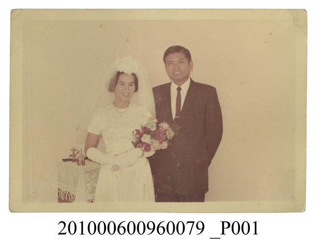 1.本文物為結婚婚紗照,著西裝男子與手持花束戴頭紗著白裙女子站立合影之照片,照片中男子身穿西裝,梳油頭,打扮非常正式;女子頭披白紗,身穿白裙,雙手帶著手套配有許多飾品,右手持一花束。2人露齒微笑面對鏡頭合影。為物件編號2010.006.0096「屏東女中林德泉老師之家庭相簿」內的相片;物件編號2010.006.0096.0018、0079、0141應屬於一系列照片,照片人物相同。2.照片人物據鄭冠榮老師、王德明老師、陳萬足女士之訪談,推測為屏東女中體育老師林德泉老師的大女兒林純珠結婚照。